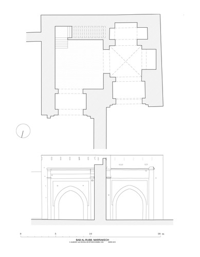 A la vista de esta disposición interna, queda claro que se trata de una puerta con doble recodo en el recorrido interno. Pero lo que no está claro es en qué sentido se hacía la entrada desde el campo a la ciudad, si accediendo por el arco occidental y girando dos vedes a la izquierda para desembocar por el oriental o si al revés, entrando desde el campo por el oriental y girado a la derecha sucesivamente para penetrar por el occidental a la plaza. Una fotografía aérea de 1917 que hay en la Inspección de Monumentos de Marrakech muestra una situación de los muros distinta de la actual. Aunque el muro que delimita la plaza por el oeste tiene la misma situación que el actual, el límite sur es totalmente distinto: su cierre parte de la esquina noroeste de una torre del recinto de la qasba y se dirige hacia el oeste hasta unirse a otro muro perpendicular que partía del centro del bastión entre las dos puertas. Según esto el acceso a la plaza se producía llegando desde el sur haciendo dos quiebros hacia la izquierda antes de alcanzar la puerta oriental y luego otros dos a la derecha dentro del bastión para salir a la plaza hacia el norte.