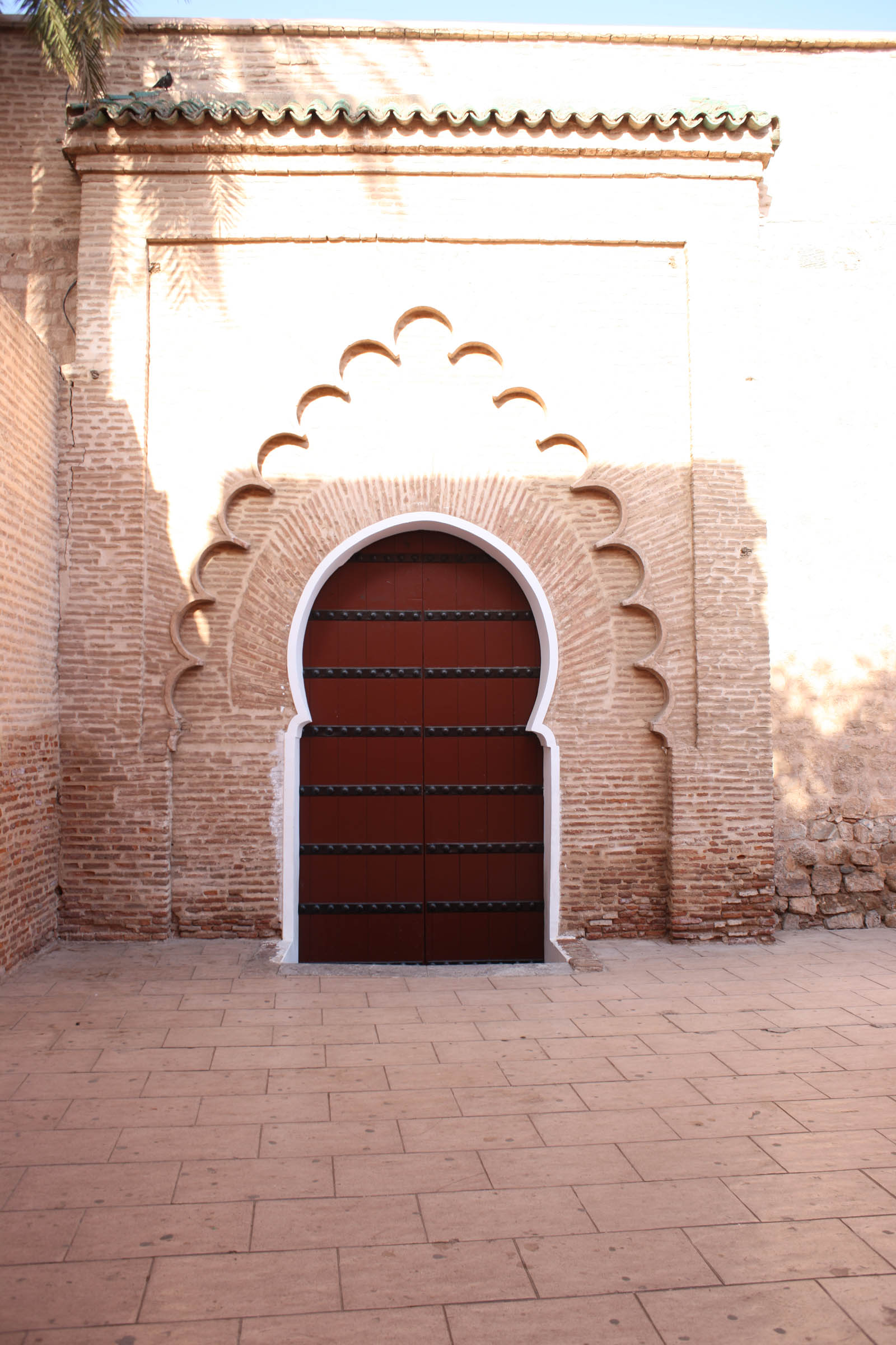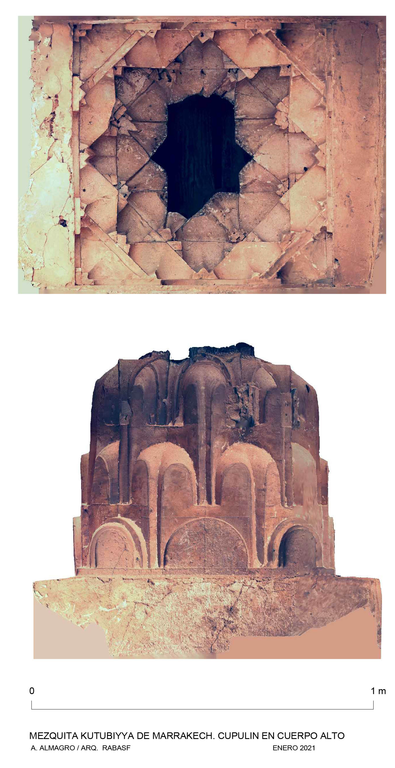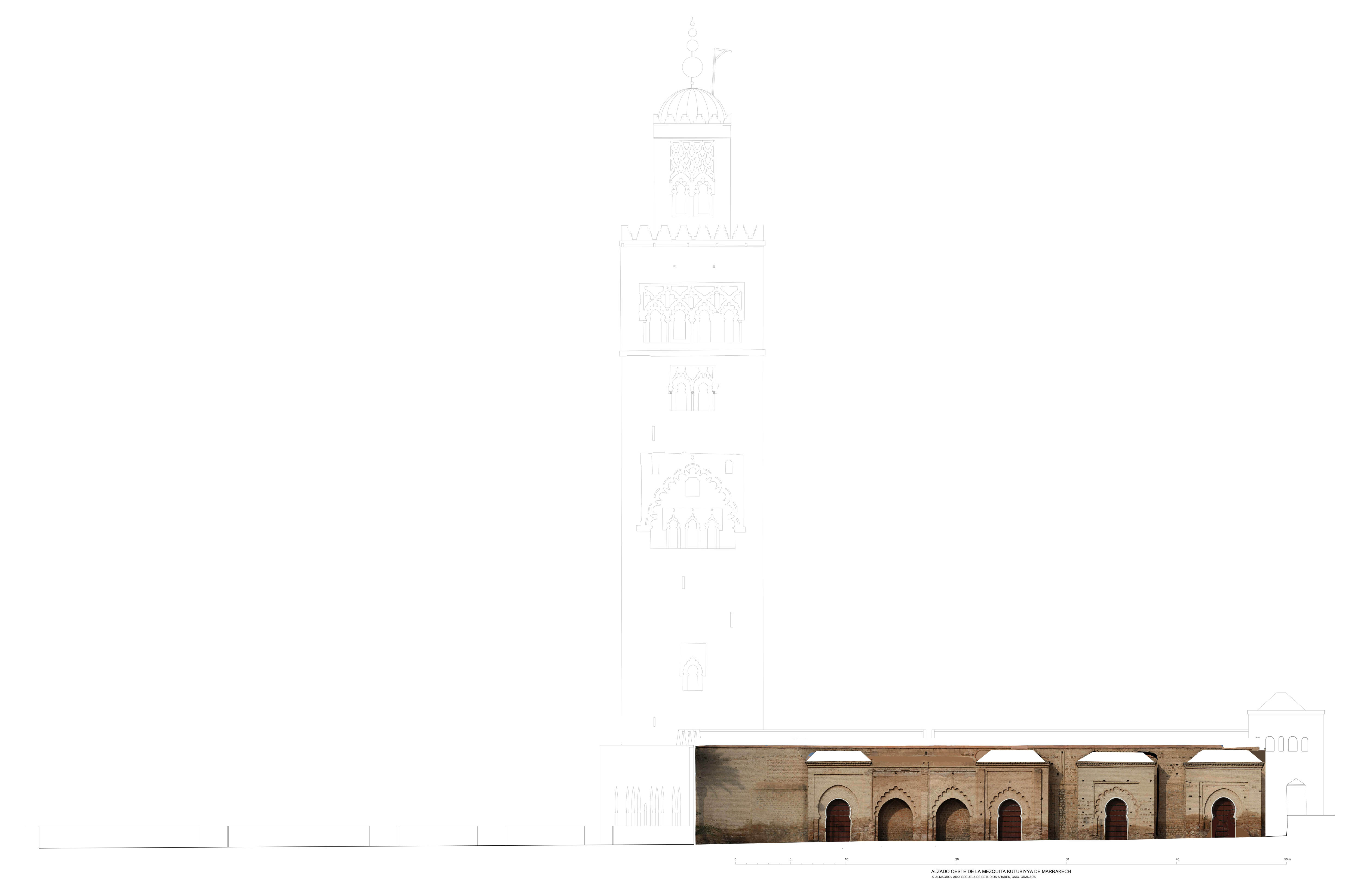 La construcción de la mezquita Kutubīyya de Marrakech fue iniciada por el califa almohade cAbd al-Mu’min en el año 1158, quizás coincidiendo con el traslado del mushaf (Corán) de Otman desde la mezquita de Córdoba a Marraketch. Este primer edificio se levantó adosado y paralelo al Qaṣr al-Ḥaŷar, la fortaleza y residencia regia construida por los almorávides en el interior de la ciudad. Las obras debieron realizarse de forma expeditiva y con materiales de fácil obtención en la localidad, tapia en los muros y ladrillo en pilares y arcos, concluyéndose en menos de un año. Posiblemente en sus inicios debió contar con una decoración muy elemental o quizás ninguna. Esta mezquita poseyó un alminar para cuya construcción se regruesó y sobreelevó una de las torres de ángulo del castillo almorávide. A través de la base de la nueva torre pasaba una calle que discurría por el lado oriental de la alcazaba y de la mezquita.