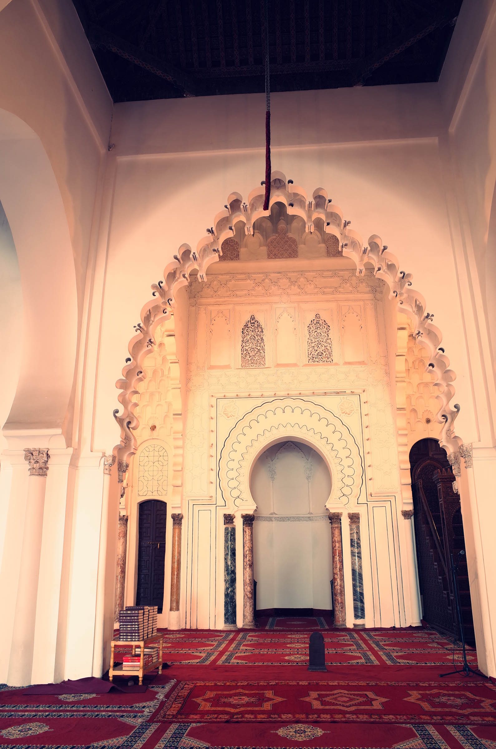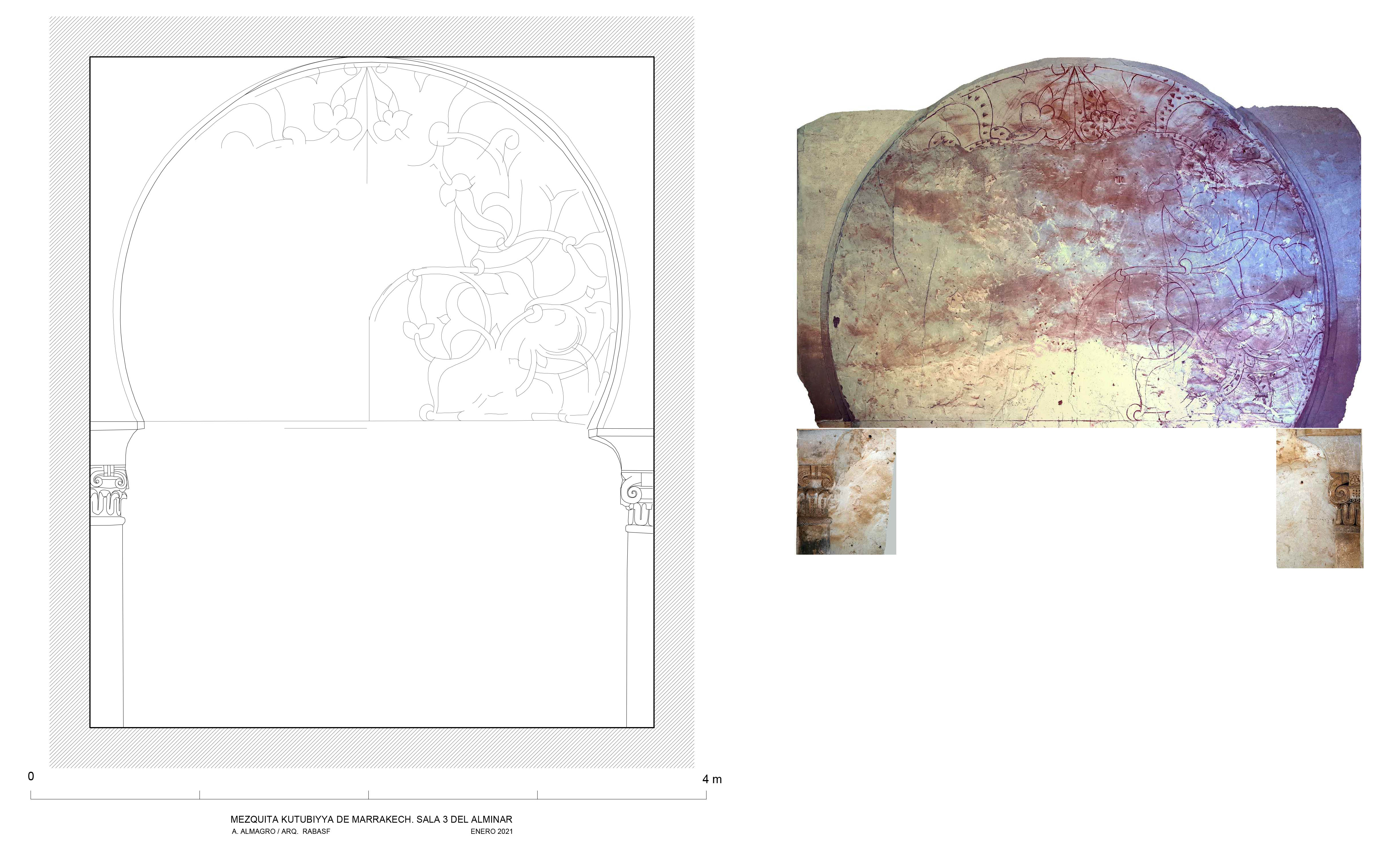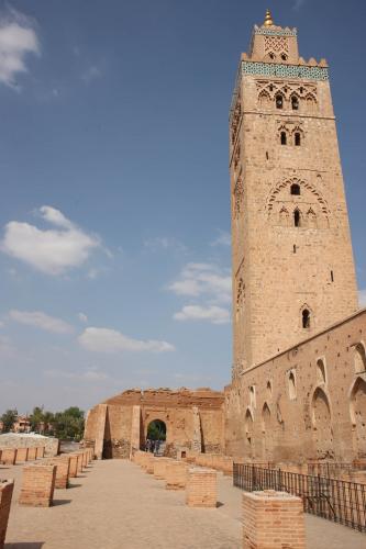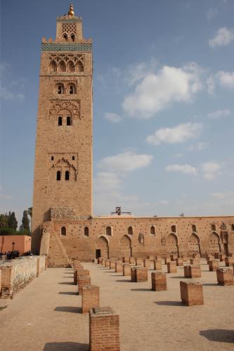La construcción de la mezquita Kutubīyya de Marrakech fue iniciada por el califa almohade cAbd al-Mu’min en el año 1158, quizás coincidiendo con el traslado del mushaf (Corán) de Otman desde la mezquita de Córdoba a Marraketch. Este primer edificio se levantó adosado y paralelo al Qaṣr al-Ḥaŷar, la fortaleza y residencia regia construida por los almorávides en el interior de la ciudad. Las obras debieron realizarse de forma expeditiva y con materiales de fácil obtención en la localidad, tapia en los muros y ladrillo en pilares y arcos, concluyéndose en menos de un año. Posiblemente en sus inicios debió contar con una decoración muy elemental o quizás ninguna. Esta mezquita poseyó un alminar para cuya construcción se regruesó y sobreelevó una de las torres de ángulo del castillo almorávide. A través de la base de la nueva torre pasaba una calle que discurría por el lado oriental de la alcazaba y de la mezquita.