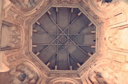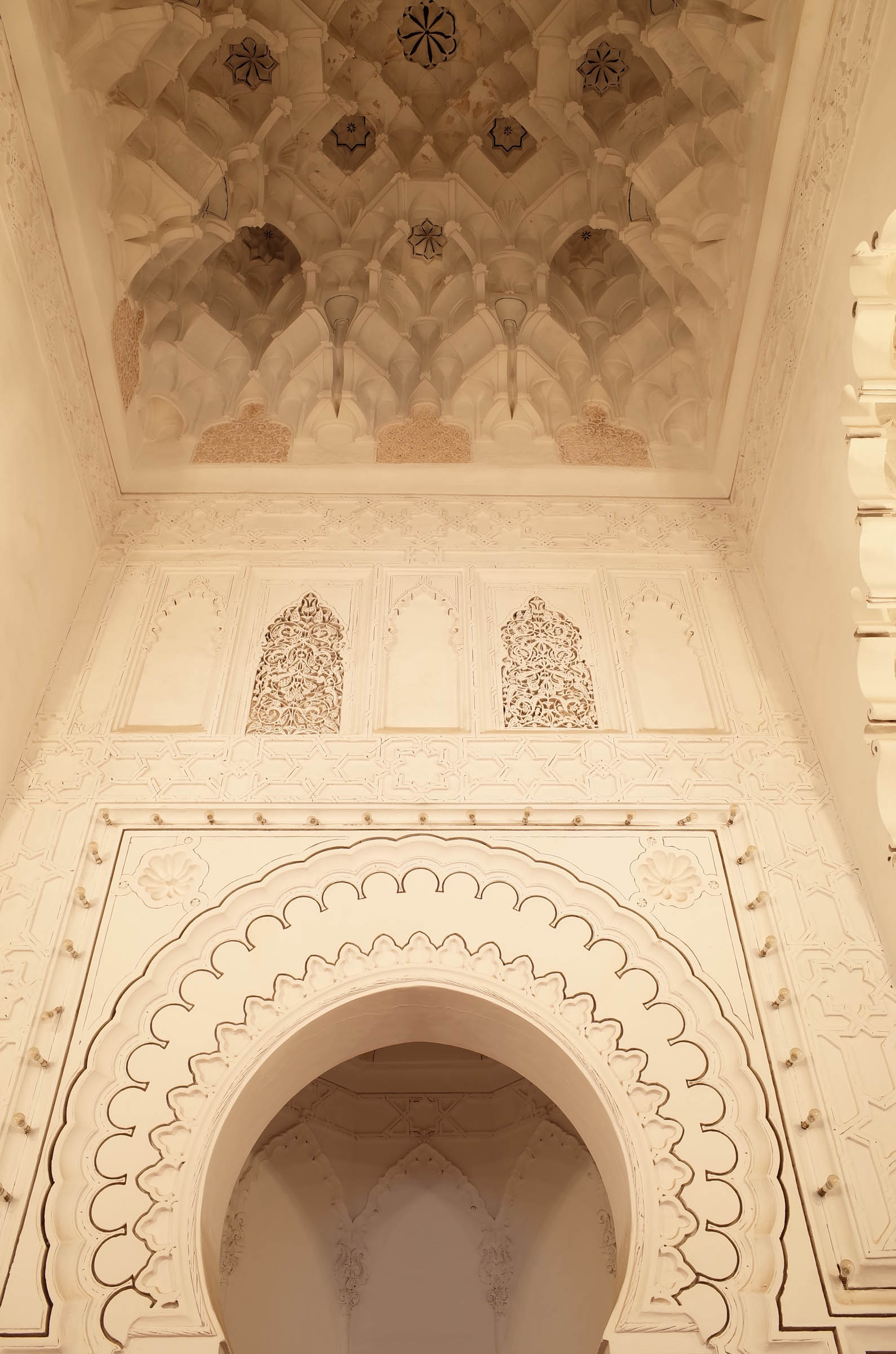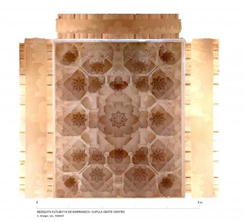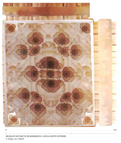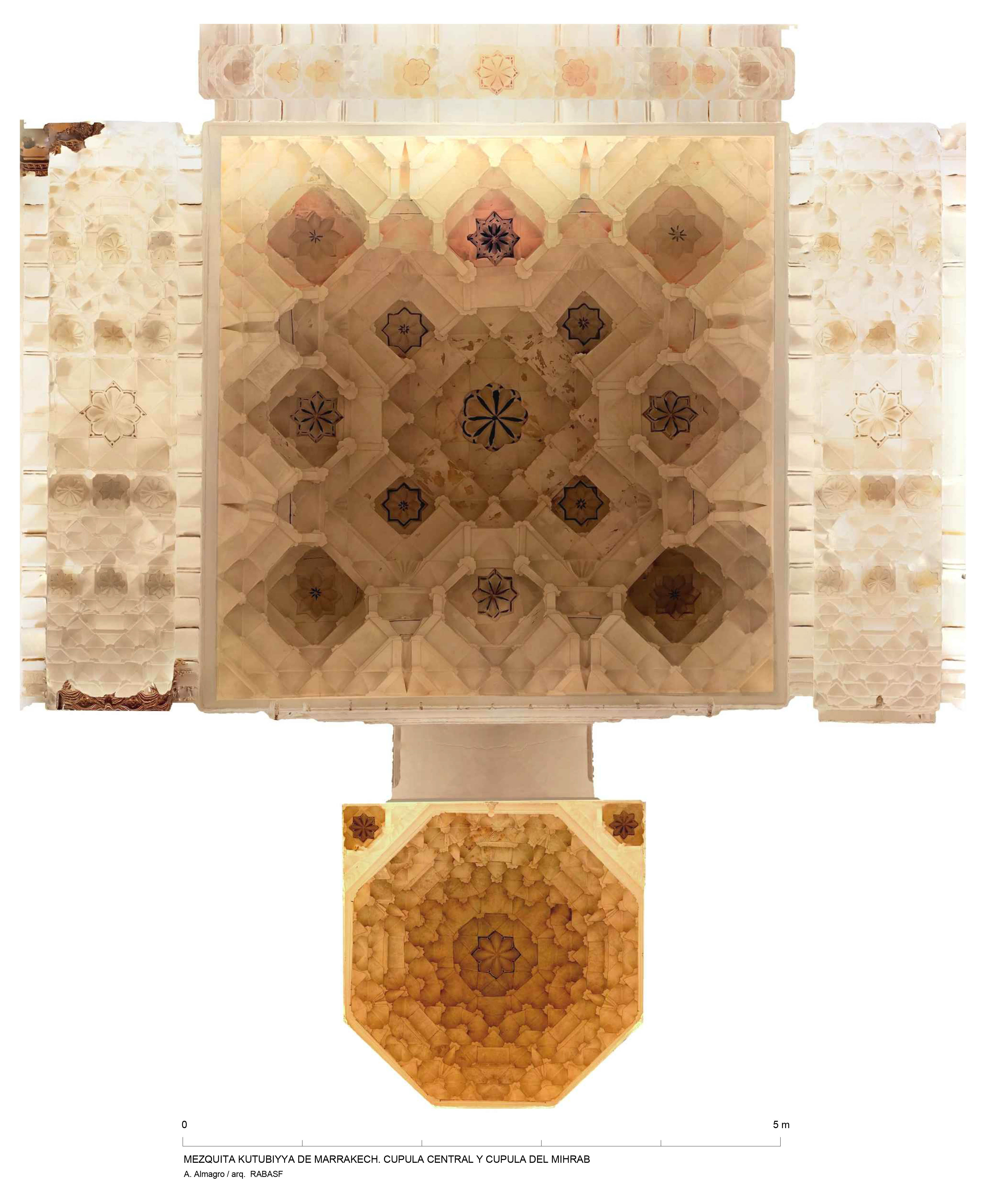 En la nave paralela al muro de la alqibla, sobre los respectivos frisos, aparecen los canes de sus cuatro estructuras, que, como sus tirantes, están repartidos de formas distintas, pese a que las cuatro armaduras tienen la misma luz y sus longitudes son muy parecidas; los aliceres altos son lisos, mientras los bajos están decorados con arcos de herradura, túmidos o lobulados, casi todos con zarcillos, que se ligan en los arranques. Los pares van a «calle y cuerda», con menado. Lo más decorado de estas armaduras, apeinazadas y con limas moamares, son los paños de lazo, de estrellas de ocho en las más centrales y de octógonos en las extremas. La cabecera de la mezquita se completa con cinco espectaculares techos de mocárabes de yeso del modelo occidental, es decir, de formato pequeño, a las que podemos agregar la cúpula del propio miḥrāb. Todo parece indicar que las bóvedas y las armaduras de esta nave son originales.