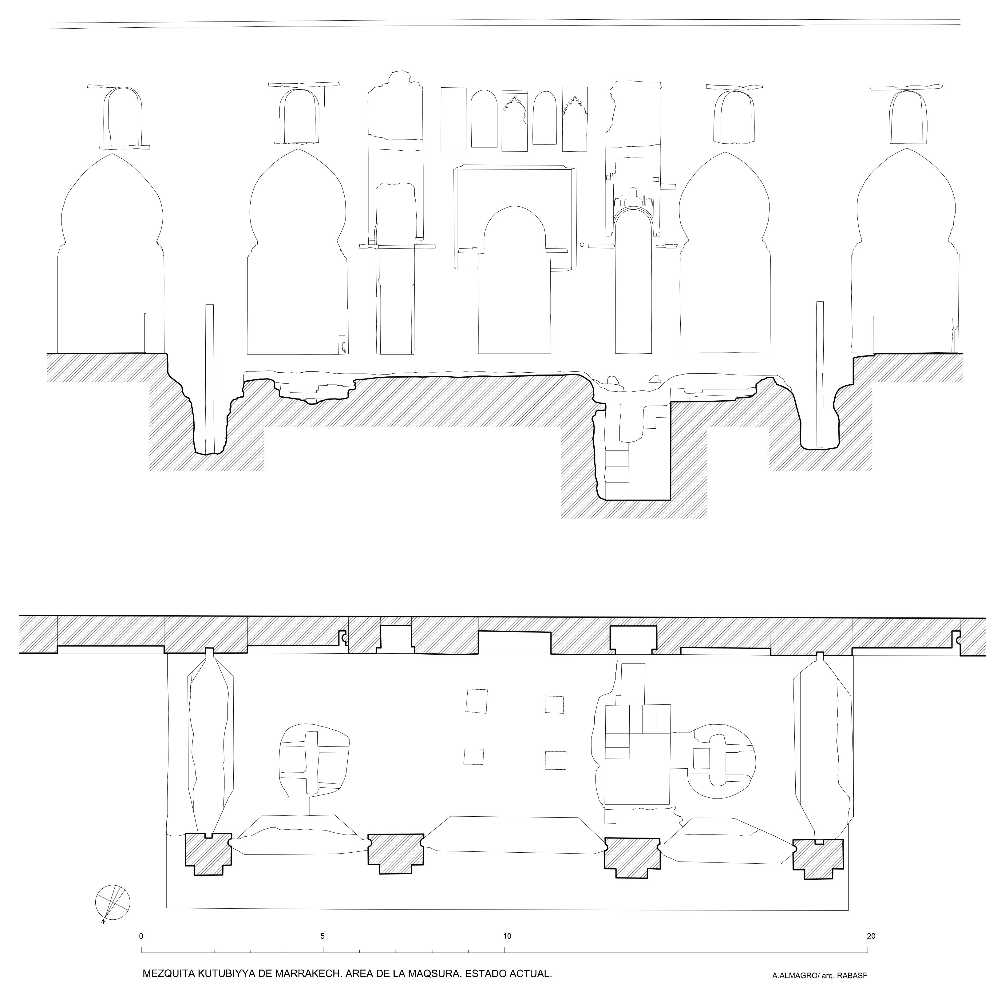 Centrado en el patio existe un aljibe con dos naves abovedadas, articuladas en cuatro tramos. En la maqṣūra, dispuesta en los tres tramos centrales de la nave de la alquibla, se conservan los restos de lo que se ha interpretado como la infraestructura de un cierre retráctil descrito por los cronistas. La fachada oriental presentaba estribos enlazados por medio de arcos, formando una fachada porticada.