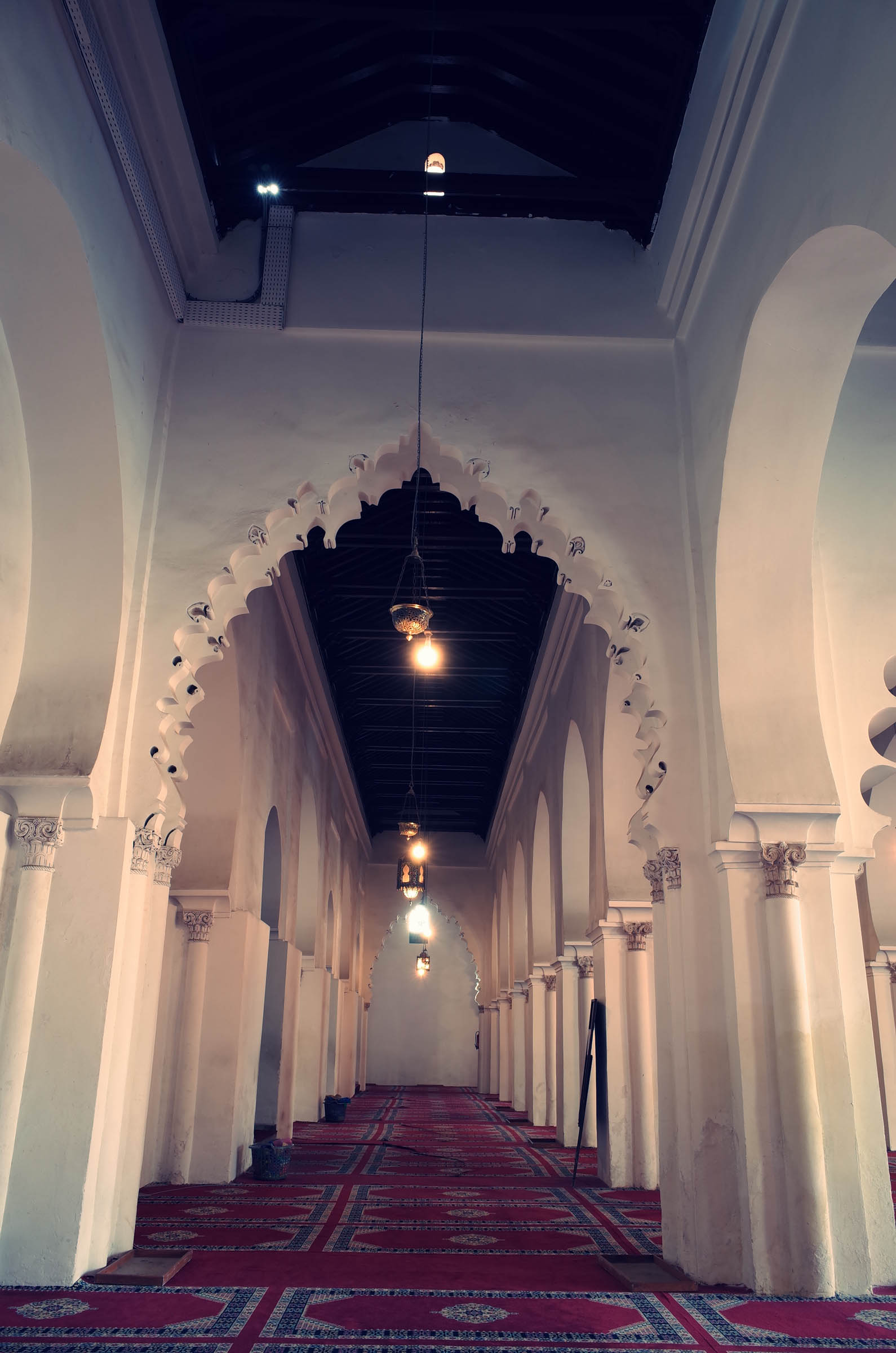 El espacio de esta primera mezquita es posible imaginarlo gracias a lo que se parecen sus rastros a las disposiciones completas de su posterior ampliación. Su planta contaba con una nave transversal paralela al muro de la alquibla y diecisiete perpendiculares a ésta, definidas por hileras de arcos de herradura apuntada, enmarcados por un sencillo alfiz. La sala de oración tenía seis tramos de arcos y las prolongaciones de las cuatro naves extremas, que conforman el patio, otros cuatro. La nave axial presenta una anchura bastante mayor que el resto y las dos que la flanquean son solo ligeramente más anchas que las demás. Esto confiere al edificio la típica disposición en “T”, bien marcada por la nave axial y la contigua al muro de alquibla, pues resultan de anchura similar. Cinco espacios distribuidos a lo largo de esta nave funcionaban a modo de linternas, seguramente cubiertas con cúpulas de mocárabes, cuya existencia viene probada por la ausencia bajo ellas de arcos de comunicación con la ampliación. El patio ocupaba el centro de la zona septentrional de la mezquita, correspondiendo a nueve naves y cuatro tramos de arcos; al quedar adosado al Qaṣr al-Ḥaŷar carecía de pórtico en ese lado.