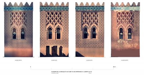 Los huecos y la decoración, a compás de las cotas de la rampa, se despliegan en 43,84 m de altura, hasta un listel saliente que nivela todo el exterior; 9,32 m más arriba otro listel similar da paso a las almenas. La decoración y los huecos principales de las cuatro fachadas siguen una rígida ordenación axial, con tres composiciones independientes en cada una, que nuestros dibujos documentan; en la zona inferior, que es lisa, los huecos son simples saeteras dispersas, salvo la composición de la parte inferior de la cara oeste, la del acceso, que no sigue el eje general pues se centró con el lado este del pequeño patio en el que se abre la puerta. Entre los listeles mencionados aparecen dos temas superpuestos, idénticos en las cuatro fachadas; el más bajo lo forman cuatro arcos de herradura túmida, algunos practicables, alojados en otros tantos arcos, lobulados y entrecruzados, sostenidos por cinco columnillas sin basas. El tema alto, arrimado al listel superior, es un paño de azulejos verdosos y blancos, un mosaico de cuadrados y hexágonos que vuelve en las esquinas, perforado por unas sencillas gárgolas. Finaliza cada cara con seis merlones completos y dos medios, de cinco gradas cada uno.