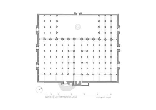 Esta mezquita es, en su disposición, una clara derivación de la mezquita Kutubiyya de Marrakech. De tamaño algo menor al contar con solo 13 naves en lugar de 17 pero con similar número de arcos en sus pórticos. La organización de la nave transversal inmediata al muro de la qibla es también semejante. Pese a su indudable interés es sorprendente la escasa referencia que se ha hecho a este edificio en la literatura científica, sobre todo si tenemos en cuenta que corrobora muchas de las características de otras mezquitas contemporáneas. Por ejemplo, la disposición de una armadura única y continua en la nave axial ratifica nuestra hipótesis de que una solución semejante fue la que tuvieron en su origen tanto la mezquita Kutubiyya como la de la Qasba de Marrakech. También la disposición de cinco espacios para ser cubiertos con bóvedas de mocárabes, aunque no llegaran a completarse, muestra que este modelo, además de en la Kutubiyya y en Salé, fue seguramente el que se adoptó en la mezquita almohade de Sevilla, es decir, en los casos en que el número de naves era igual o mayor de trece.
