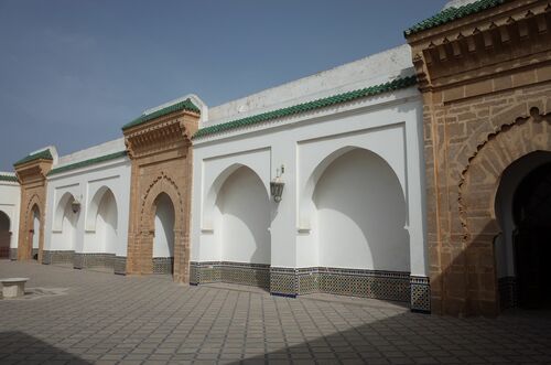 La mezquita cuenta con dos espacios dispuestos a ambos lados de ella que están cerrados con tapias conformando dos patios, semejantes a ziyadas o espacios que separan ciertas mezquitas del resto de edificaciones no religiosas, algo inusual en el Magreb. A través de ellos se accede a las puertas laterales de la sala de oración. Dos puertas en cada uno los comunican con la calle. Estos patios han sufrido reformas en época reciente según se desprende de la observación de fotografías de la primera mitad del siglo XX. En concreto se construyeron arcos ciegos adosados al muro de la mezquita que unen las portadas produciendo una fachada enrasada que recuerda soluciones como las de la parte inicial de la mezquita Kutubiyya, las fachadas oeste y norte de la de la Qasba de Marrakech o de la mezquita Hassan de Rabat, pero que en absoluto corresponden en este caso a la obra original. También se han construido edificaciones precedidas por pórticos en los lados menores de estos espacios.