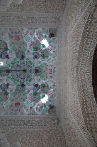 Los arcos que forman la estructura general de las naves son de herradura ligeramente apuntados, con cuatro centros de curvatura y arranque en nacelas que sólo vuelan hacia el interior de los arcos, dando lugar a que los frentes de las arquerías sean totalmente lisos al carecer de alfices todos los huecos. Todas las arquerías longitudinales de la sala de oración están formadas por seis arcos. La arquería dispuesta en paralelo al muro de la qibla y que determina la nave transversal, está compuesta por arcos lobulados de 13 lóbulos todos ellos. Sólo el arco central que da acceso al espacio cubierto por la bóveda de mocárabes está formado por un doble arco mixtilíneo de formas vegetales o de lambrequines que deja un espacio intermedio decorado con sebkas incisas de hojas de palma. Arcos semejantes se disponen de forma transversal a lo largo de la nave paralela al muro de la qibla, definiendo los cinco espacios que sin duda se proyectaron con sistemas de cubrición semejantes al del centro de la nave.