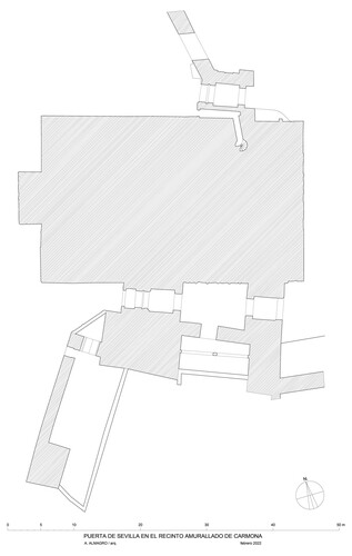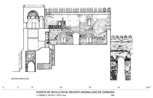 La Puerta de Sevilla en la ciudad de Carmona ya estaba conformada en el Alto Imperio romano como una masa paralelepipédica (Bastión), flanqueada por dos pasos al interior de la ciudad (Puerta, a Sur y Poterna, a Norte), con una torre en su frente exterior (Torre del Homenaje) y un foso recortándola por delante; la cara superior del Bastión, aislada de la puerta mediante un muro romano (la Cortina), estaba casi totalmente ocupada por un edificio religioso, el Templo; no sabemos cómo se relacionaba este plano superior con el interior de la ciudad.