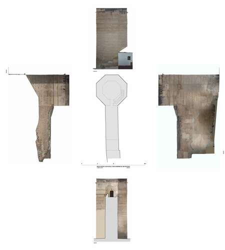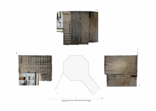 Lo más representativo de este recinto son las tres torres albarranas construidas en el frente norte. Son de planta octogonal como tantas otras levantadas por los almohades, sobre todo en al-Andalus. La primera de ellas está situada en el vértice noroeste y se separa más de 20 metros de la muralla a la que se une por medio de un grueso muro, a modo de pedúnculo, de más de 3 m de espesor. Las edificaciones adosadas, sobre todo en su lado oriental, no permiten ver con claridad el entronque de la muralla y el pedúnculo de la albarrana aunque parece que, como en las otras torres, hubo un arco o pasaje que lo atravesaba. Su planta octogonal se inscribe en una circunferencia de 5,20 m de radio. Actualmente la torre apenas se sobre eleva respecto al adarve de la muralla por haber sido desmochada. Debió contar en su origen con un cuerpo alto, seguramente con cámara interna y acceso a la terraza a través de esta, como sucede en otras torres semejantes.